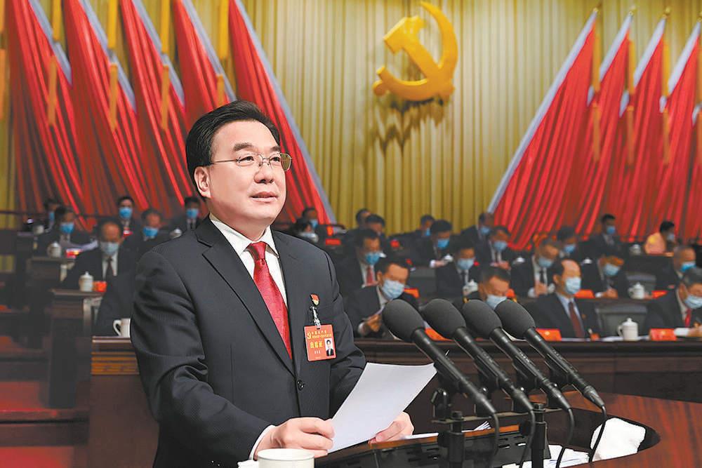 信长星同志代表中国共产党青海省第十三届委员会向大会作报告。本报记者 张地委 摄