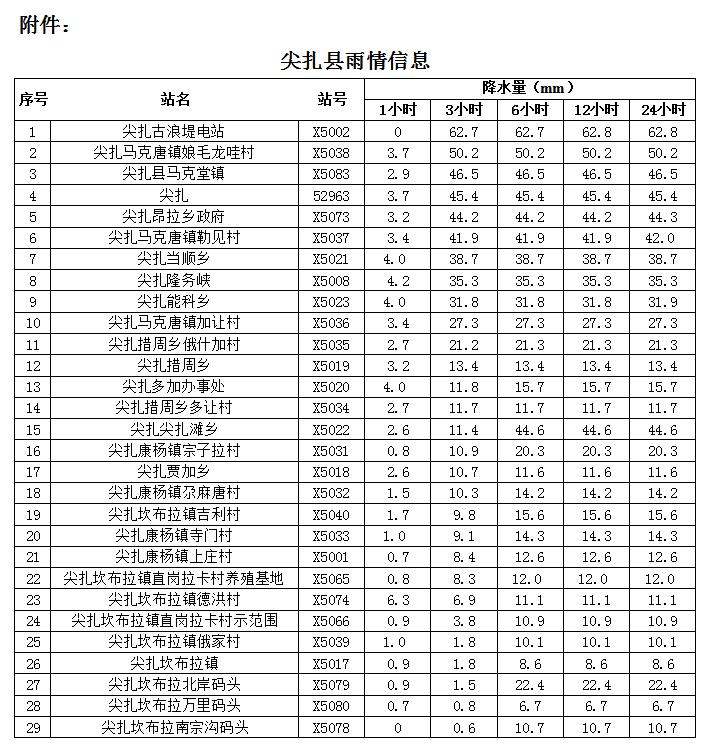 今天下午15 时起,尖扎地区出现了短时强降水,并伴有雷电等强对流天气。据了解,21日15时至22日01时,尖扎有两个站次出现大暴雨天气。降水中心位于尖扎古浪堤电站,雨量达到62.8毫米,最大小时雨强达到53.5毫米(出现于22-23时)。截至22日01时尖扎马克唐镇娘毛龙哇村50.2毫米、尖扎县马克堂镇:46.5毫米、尖扎国家站:45.4毫米、尖扎尖扎滩乡:44.6毫米、尖扎昂拉乡政府:44.2毫米、尖扎县马克唐镇勒见村:41.9毫米、尖扎当顺乡:38.7毫米、尖扎隆务峡:35.3毫米、尖扎能科乡:31.8毫米,其余车站均在30mm以下。期间尖扎县气象局发布雷电黄色预警2期,暴雨黄色1期,暴雨橙色1期,暴雨红色2期,山洪灾害气象风险预警2期,地质灾害气象风险预警2期。