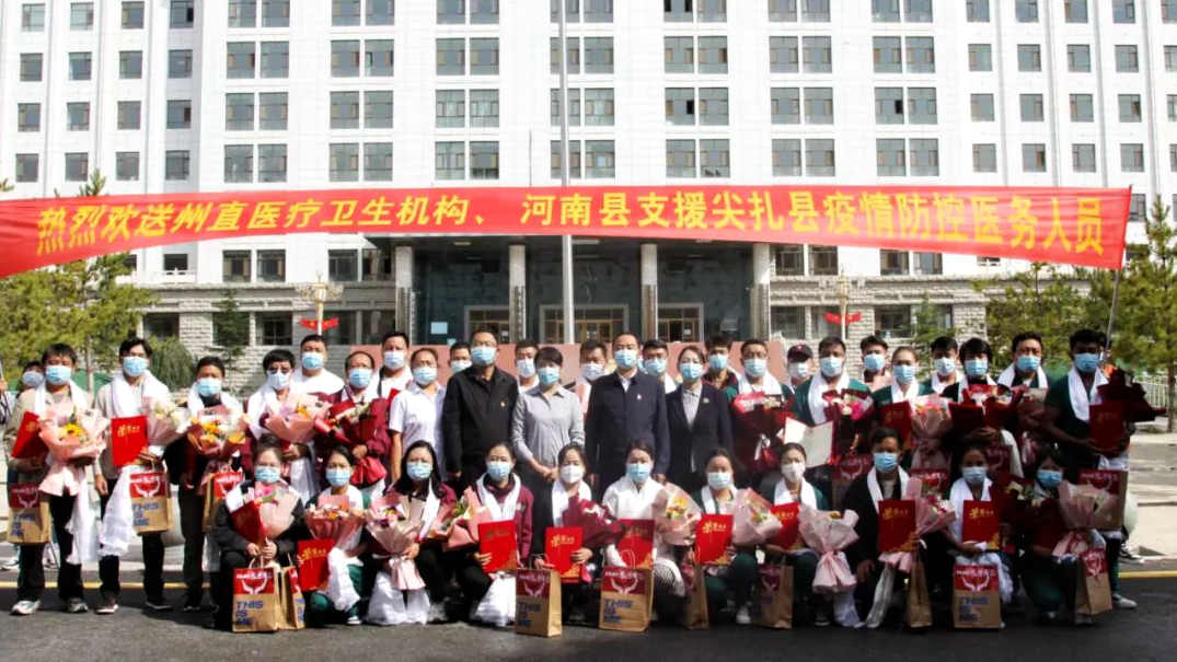 心怀感恩,战“疫”必胜。经过长达2周的奋战,兄弟市县支援尖扎县疫情防控的各方力量圆满完成了各项工作任务。9月4日,尖扎县委、县政府为支援队伍举行了欢送仪式,县委书记、县政府县长亲自出席欢送仪式,县委副书记何春德作了致辞讲话,县党政领导班子成员向他们送上了鲜花、献上了哈达,并代表全县各族群众,向支援队伍致以最崇高的敬意和最诚挚的感谢。