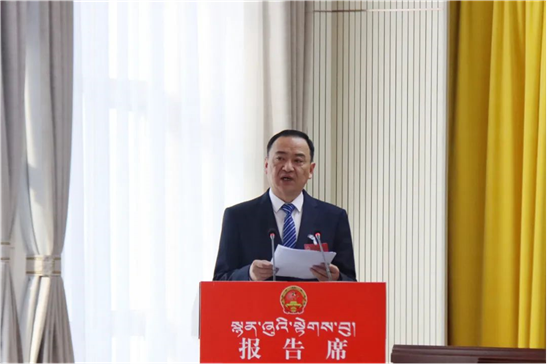 县委书记、大会执行主席才科杰,大会执行主席何春德、曹生辉、李军山、卓果吉、马海胜、才多加在主席台前排就座。
