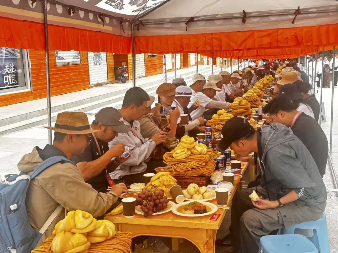 众宾齐聚品美食,深化友谊迎赛事。巡街展演结束后,所有运动员、裁判员、贵宾、嘉宾以及中央驻省、州、县等媒体记者齐聚一堂,共同参加国家级非遗项目——尖扎达顿宴展示体验活动,丰盛的美食、醇香的美酒、悠扬的歌声,让四面八方的宾朋和参赛运动员在浓郁的民族氛围中品味美食、畅叙友情,进一步增进了沟通与了解,深化了友谊与合作,为即将展开的箭术角逐营造了团结、和谐、欢乐的良好氛围。