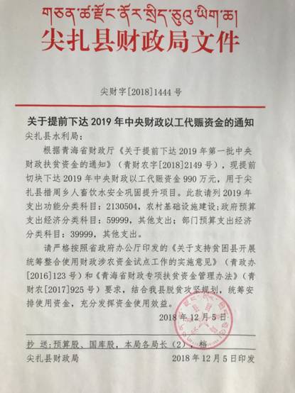 关于提前下达2019年中央财政以工代赈资金的通知
