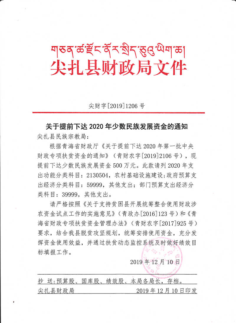 尖财字[2019]1206号 关于提前下达2020年少数民族发展资金的通知