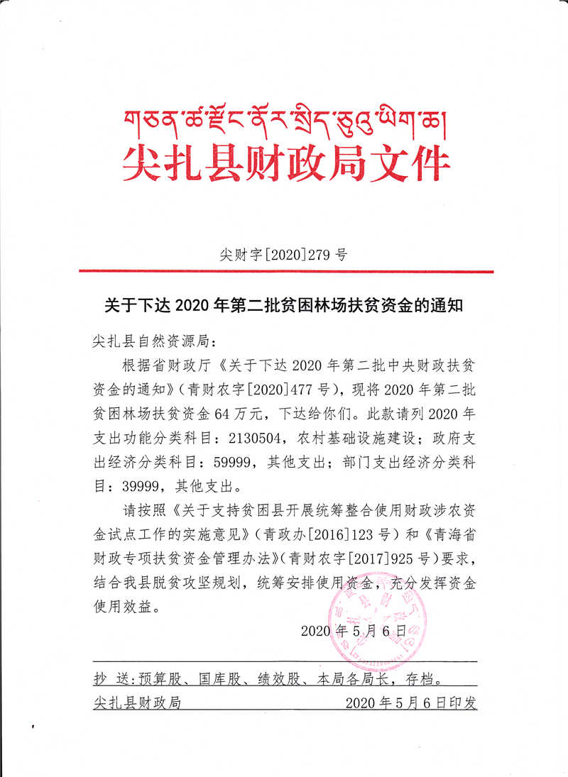 尖财字[2020]279号 关于下达2020年第二批贫困林场扶贫资金的通知