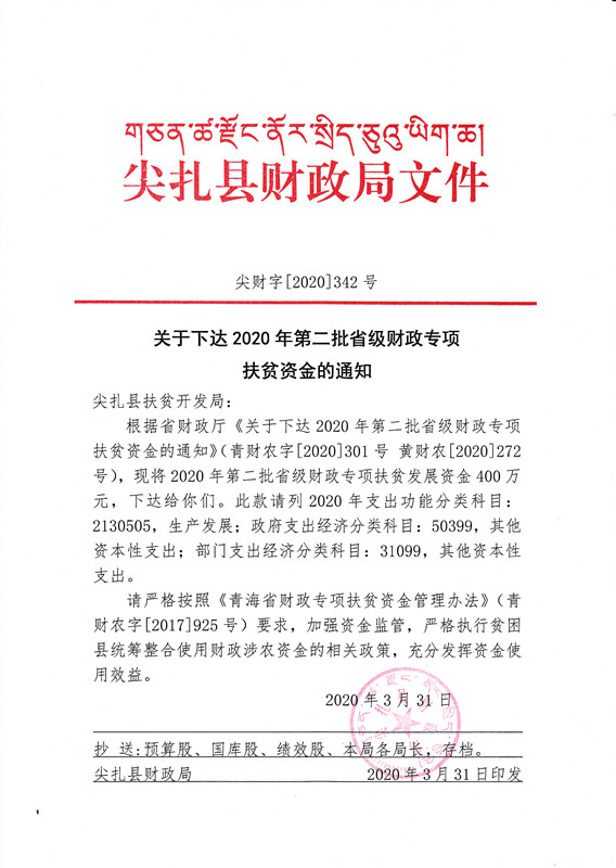 尖财字[2020]342号 关于下达2020年第二批省级财政专项扶贫资金的通知