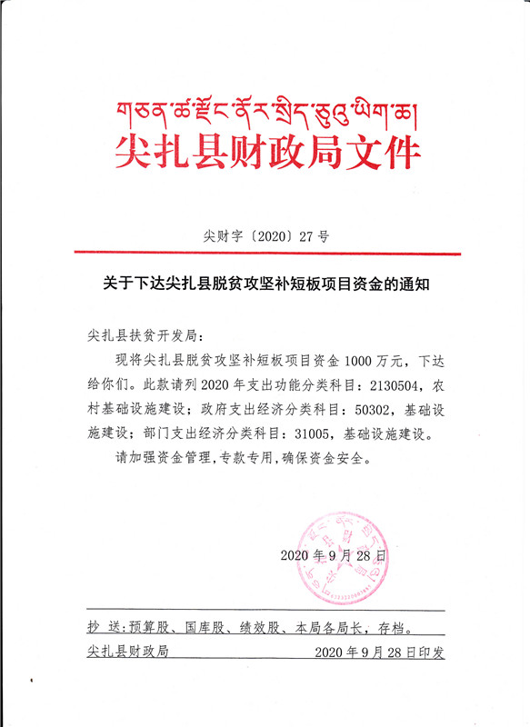 尖财字[2020]27号 关于下达尖扎县脱贫攻坚补短板项目资金的通知