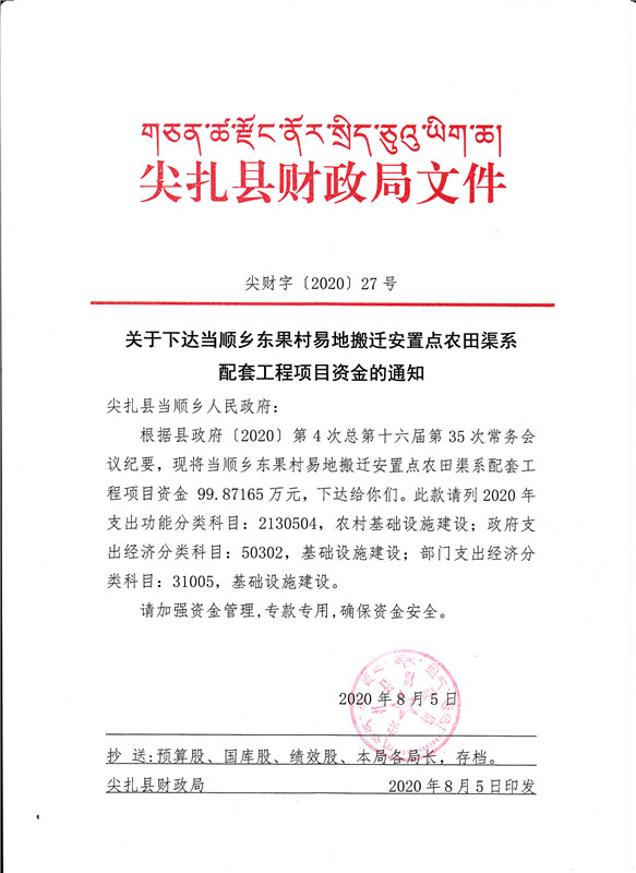 尖财字[2020]27号 关于下达当顺乡东果村易地搬迁安置点农田渠系配套工程项目资金的通知