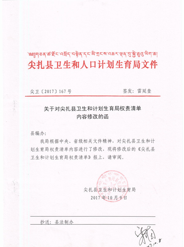 尖扎县卫生和计划生育局关于对权责清单动态调整的复函