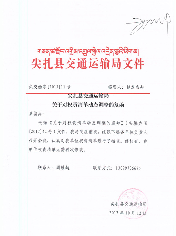 尖扎县交通运输局关于对权责清单动态调整的复函